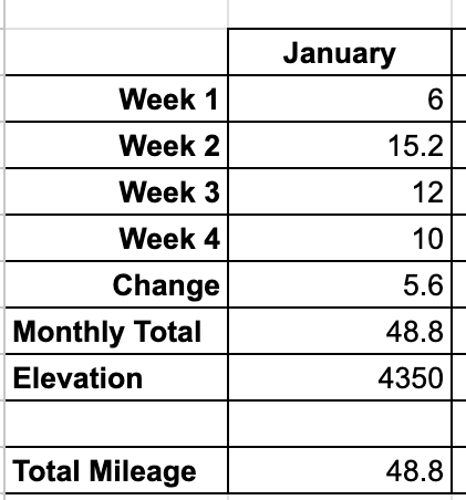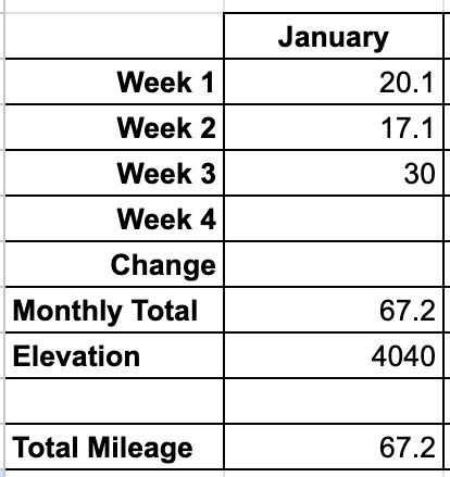 To hit the on track monthly goal, I need to be close to 8,500 at the end of January. I’ll probably be a bit short but I am still building up mileage and elevation from a running break at the end of 2025. And on a first positive week note, I hit the weekly goal this last week by hitting 2,674 feet for this week! Woohoo to progress being made.